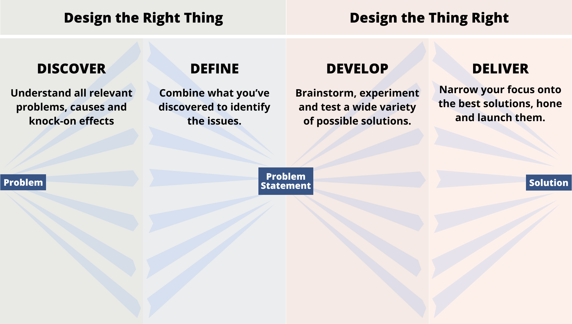 The double diamond process breaks the creation process into four stages in a manner that explains and highlights steps in the process.